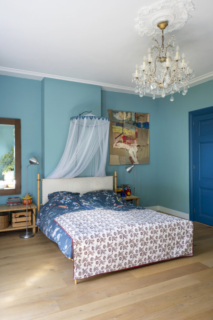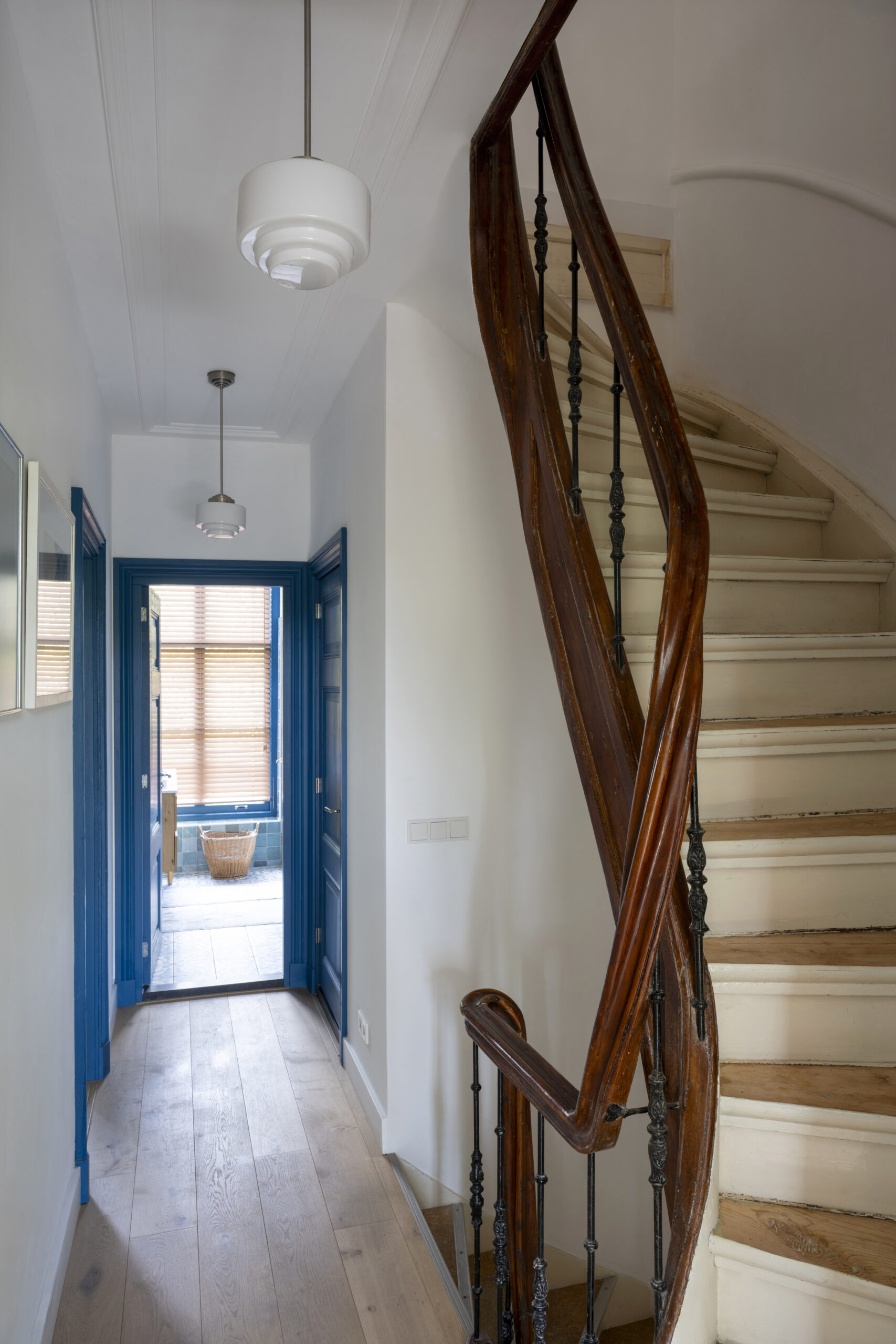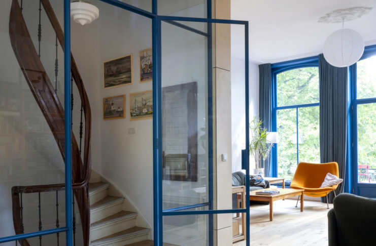 Samen met het Delftse architectenbureau Zeeuwse Jongens en een aannemer nam het stel het pand flink onder handen. Alfred: “We hebben veel zelf gedaan: slopen, schilderen, etc.” Anne: “De architect raadde ons aan de wanden in het midden van de woonkamer een modern uiterlijk te geven. Het jaren 70-schrootjesplafond werd vervangen door licht hout. Dat vormt een mooi contrast met de klassieke ornamentenplafonds aan de voor- en achterkant. Bovendien maakt het de kamer ruimer en lichter. Voor de stalen kozijnen kozen we een stevige kleur blauw. De leverancier