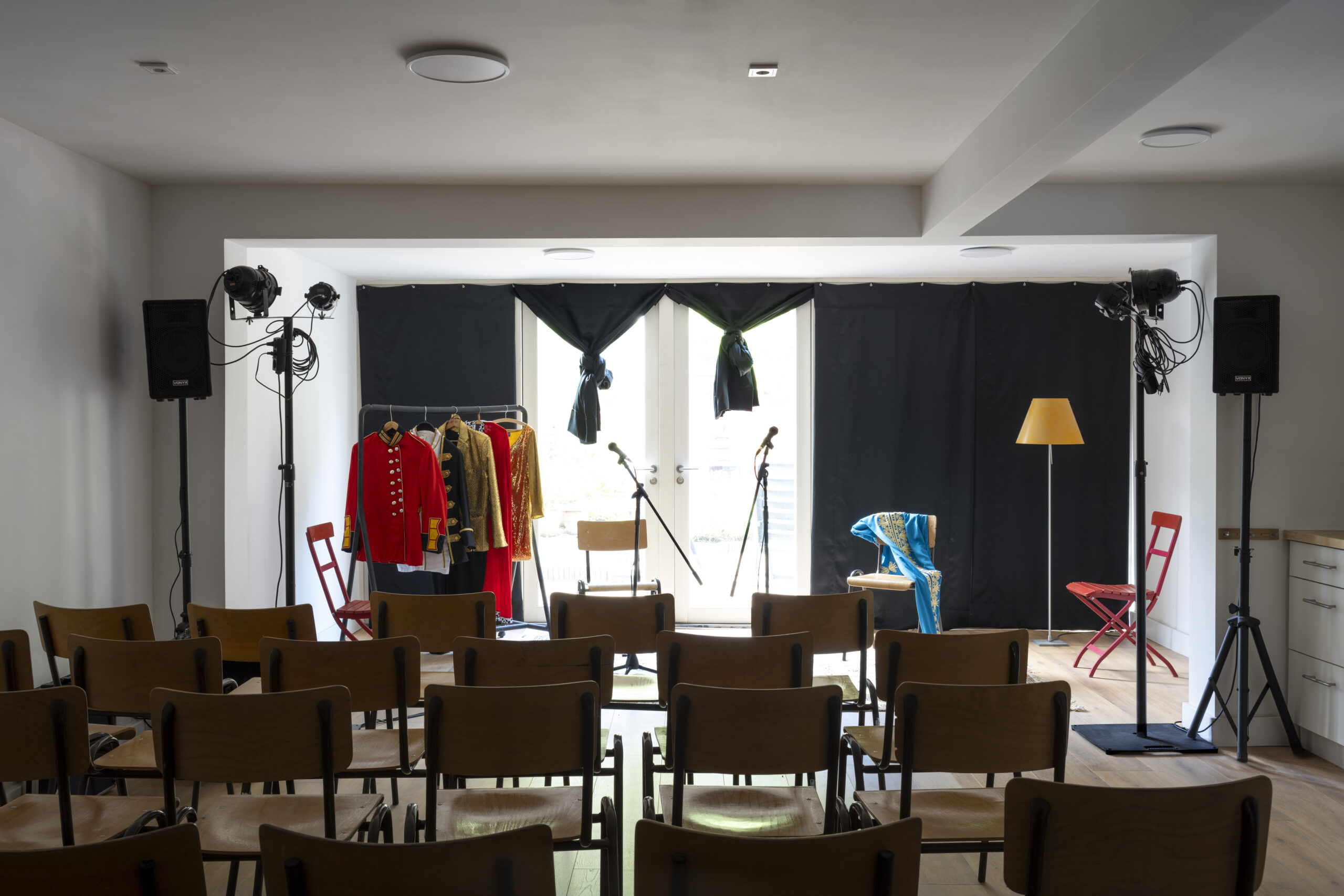 uiteindelijke keuze viel op een monumentaal pand aan de Nieuwe Plantage in Delft. Het rijtje klassieke herenhuizen van rond 1880 ligt aan een fraai plantsoen en is beschermd stadsgezicht. Dit is de plek waar Anne en Alfred hun dromen kunnen realiseren. Het overgrote deel van de begane grond, ooit een fysiotherapiepraktijk, doet nu dienst als theaterzaal. Alfred: “Deze ruimte met eenvoudige techniek stellen we beschikbaar voor theatermakers. Zo zijn we een van de locaties van het jaarlijkse Delft Fringe Festival en doen we mee aan Gluren bij de buren. Ook kunnen beginnende makers hier terecht voor try-outs. Maar het is geen plek voor bijvoorbeeld wekelijkse koorrepetities. Dat zou betekenen dat we veel thuis moeten zijn.”