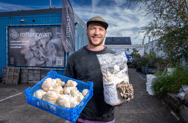 Rotterzwam kweekt paddenstoelen op organische restmaterialen, zoals koffiedik, bierbostel (een bierafvalproduct) en houtsnippers. “Het is honderd procent circulair wat wij doen”, zegt Florian de Deugd, coördinator van de kwekerij in het Rotterdamse Lloydkwartier.
